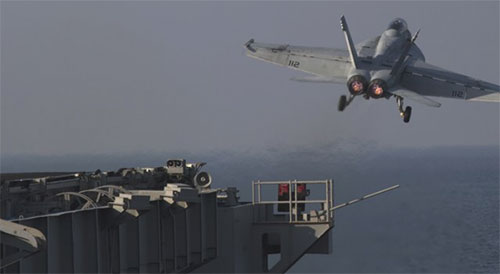 An F/A-18 fighter-bomber takes off from the USS Carl Vinson in the Persian Gulf on Dec. 8, 2014. Boeing says an issue with a supplier for the jet cost it tens of millions of dollars. (Tyler Hicks/The New York Times)