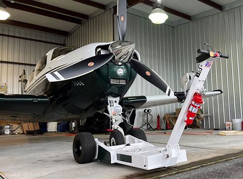A 2.5-pound halon extinguisher mounted to the aircraft tug keeps it close to the engine and fuel source. Photo courtesy of Jeff Simon.