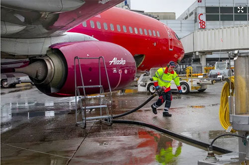 Amer Halilovic, working as a fueling agent, pulls a hose back to a hydrant cart (at right) after refueling an Alaska Airlines jet at Sea-Tac International Airport on Jan. 10, 2020. Dutch company SkyNRG has announced plans to build a massive sustainable aviation fuel refinery in Washington.
