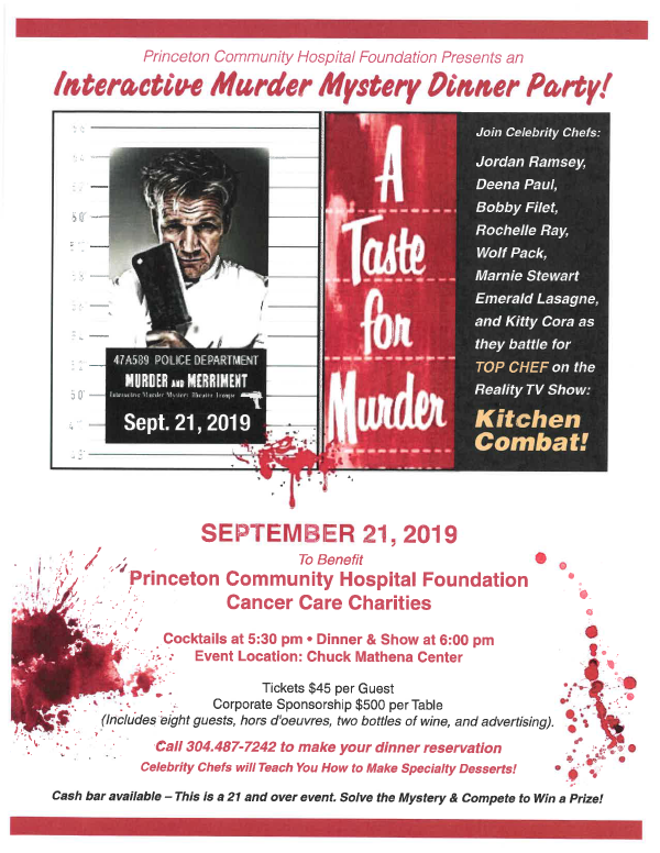 Princeton Community Hospital Foundation is hosting a murder mystery dinner party on September 21! This hospital is a non-profit organization which we hope to partner with in support of our allied health programs.