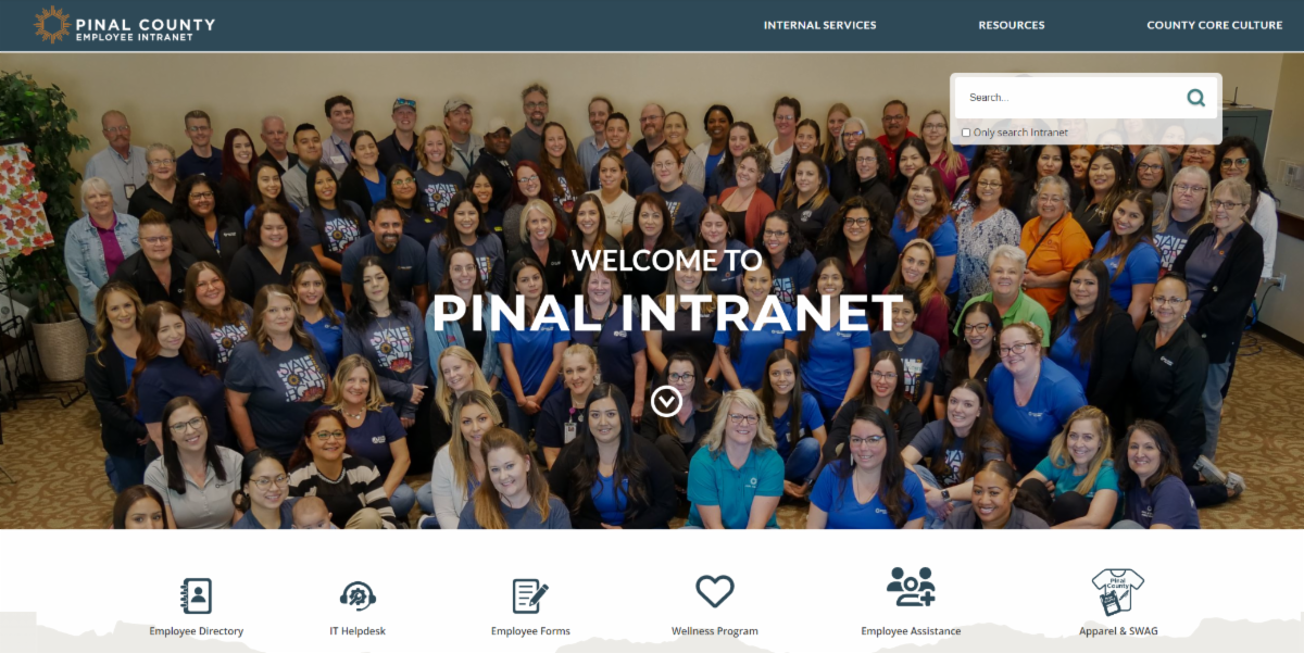 The Pinal County Employee Intranet is your one-stop shop for a range of information, including health and wellness, the latest County news, recognition, apparel, and travel reduction. Plus, access to County services such as Facilities, Fleet, IT, Salvage, and Risk Management. And it's where you can gain access to the employee self-service portal to review your paychecks!