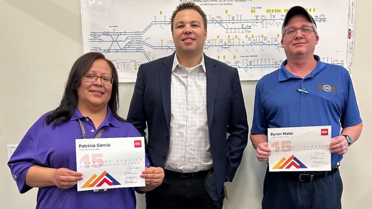 N Line Commuter Rail engineers Patricia Garcia and Byron Maler, pictured here with Rail Service Delivery Manager Phil Washington Jr., recently achieved 15 years of service at RTD! Both previously served the community operating buses for over 10 years prior to making the leap to the N Line team. They have been with the N Line since early 2020 and played a role in its opening. The N Line Commuter Rail team thanks Garcia and Maler for their many years of service and their dedication to making lives better through connections. | |