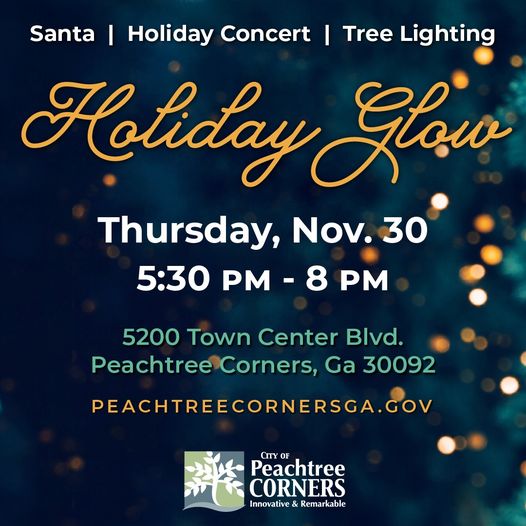 Peachtree Corners will be celebrating the holiday season by lighting a 6-foot Menorah and an innovative LED tree at the Town Green with the Holiday Glow! Mark your calendars for this FREE event on THURSDAY, November 30 from 5:30 pm - 8:30 pm.