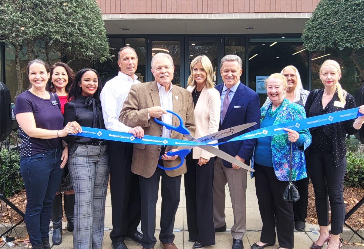 Mayor Mike Mason cuts the ribbon for ASBN, America's Small Business Network in Peachtree Corners. Pictured are: (L-R) Gwinnett Chamber Ambassador Lucy Mejia, Suzanna Martinez of the PCBA, Kimber White of ASBN, City Councilman Phil Sadd, owners Bridgette and Jim Fitzpatrick, City Councilwoman Lorri Christopher, Lisa Proctor of the PCBA, and Gwinnett Chamber Ambassador Beth Fleck.