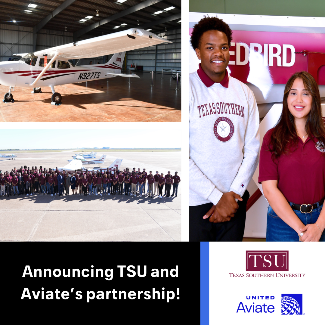 Texas Southern University is proud to partner with Aviate, the United Airlines industry-leading pilot career development program, which offers aspiring and established pilots the most direct path to a United flight deck.