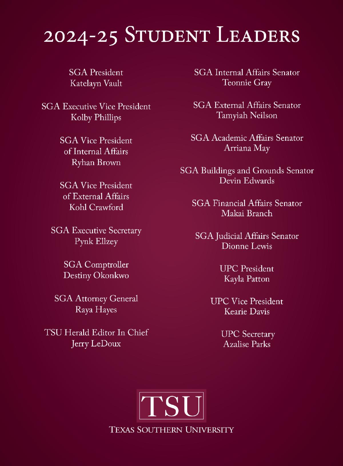 Rising senior Jackie Edwards Jr. was crowned Mister TSU. Edwards is a Radio, Television, and Film major from Sweetwater, Texas and raised in Lockhart. He served as Mister Junior for the 2023-2024 academic year. He is also a Residential Assistant, an "Eagle Scout" for Boy Scouts of America, a TSU Career Center Ambassador, and Chaplain for the Delta Theta Chapter of Alpha Phi Alpha Fraternity Inc.