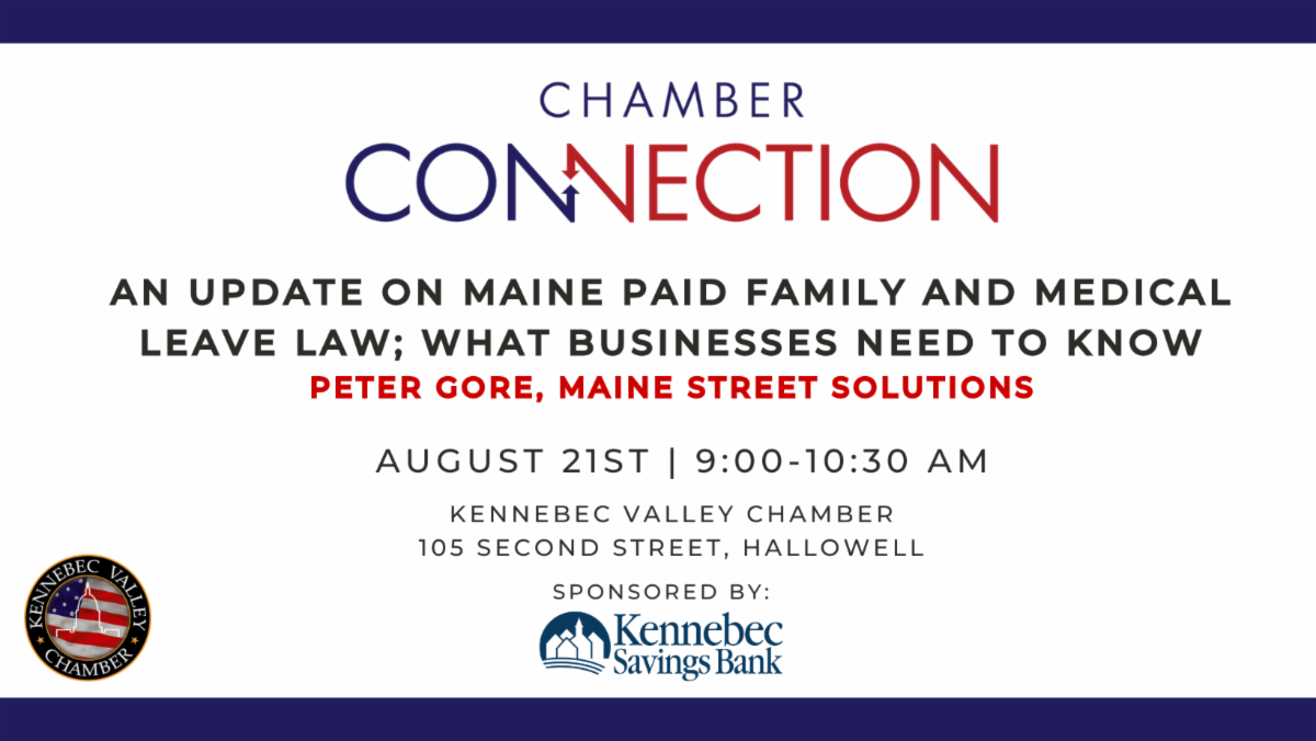 Join us on August 21st for Chamber Connection, where Peter Gore from Maine Street Solutions will be discussing the new updates to the Maine Paid Family and Medical Leave Law. If you are a business owner, knowing the changes to this law are extremely important. Spots are limited, register today! | |