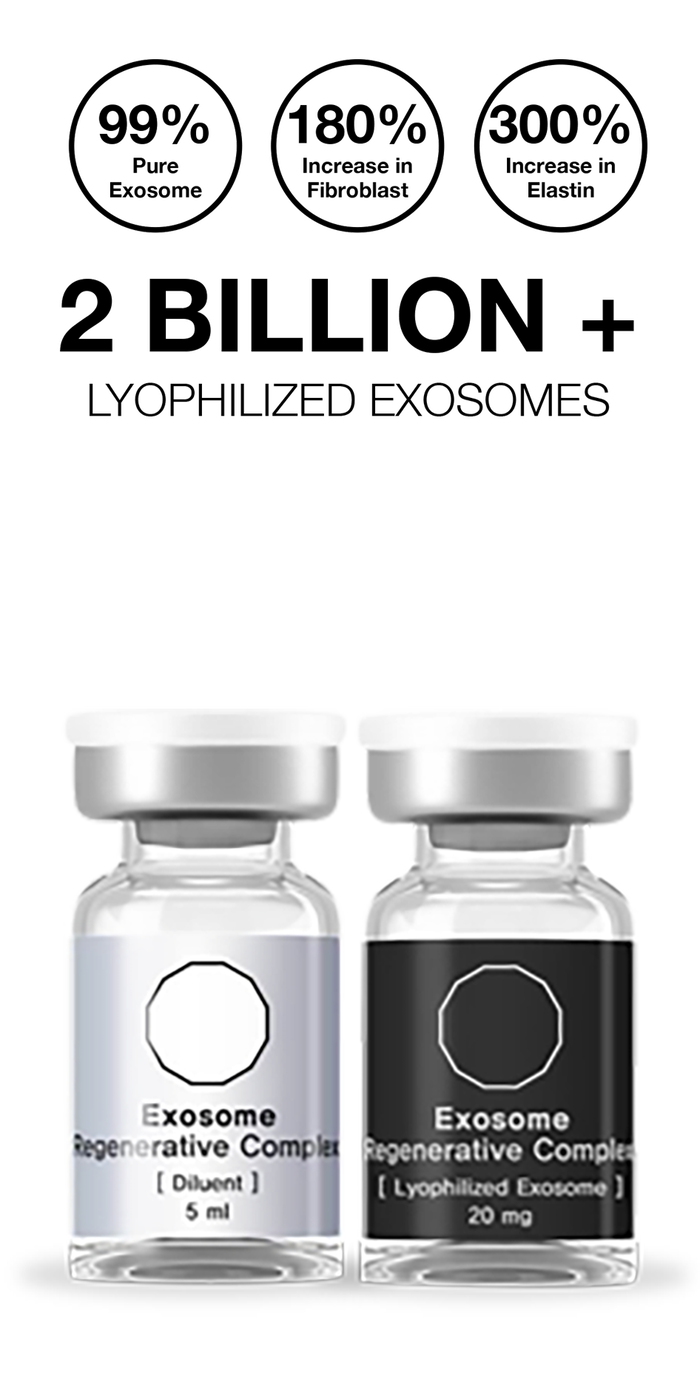 Topical Exosome Regenerative Complex. This complex has a concentrated power of 2 billion-plus stem cell-derived lyophilized exosomes and other potent elements such as hyaluronic acid and peptides to deliver extraordinary skin rejuvenation and regeneration effects.