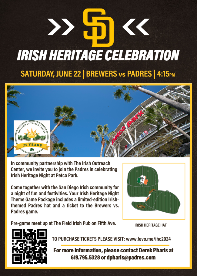 This year's Irish Heritage Celebration at Petco Park will be on Saturday, June 22nd @4:15pm.