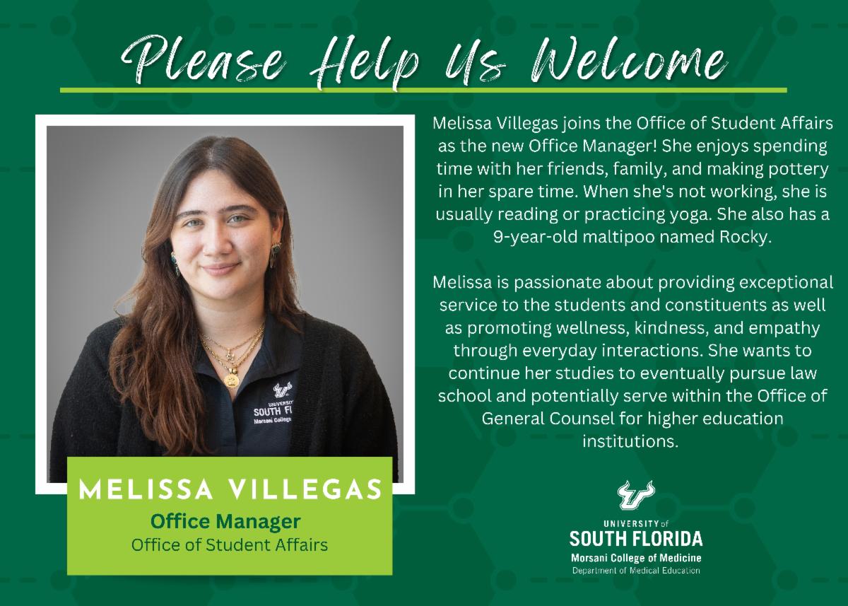 Ms. Melissa Villegas, Office Manager (the front desk of the OSA suite at MDD)