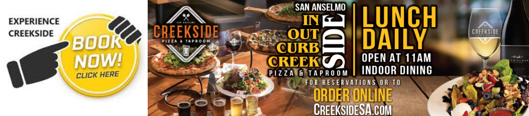 Creekside: Proud members of the San Anselmo Chamber of Commerce and the Marin County Visitor & Convention Bureau, California Restaurant Association, supporters of San Anselmo Eats, San Anselmo Beautification Committee, World Pizza Champions, Slice Out Hunger, advocates of our local community, schools, arts, enrichment and music programs and best-practices for conservation, recycling, and carbon-neutral net zero planet. Visit Creekside's sister-location, Stonework Pizza & Tap in Petaluma. | | | | |