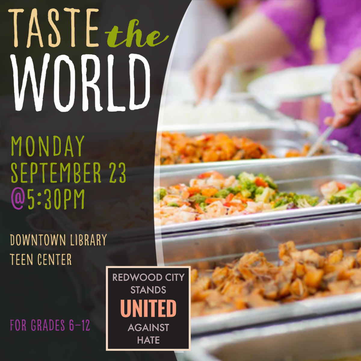 In addition to more great programs this week for Welcoming Week, we are excited to kick off United Against Hate Week on September 21. Join us with Welcoming Redwood City and community partners as we create a community that is welcoming and free of hate for all. Community members can pick up Redwood City Stands United Against Hate posters at the Downtown Library in the lobby while supplies last.