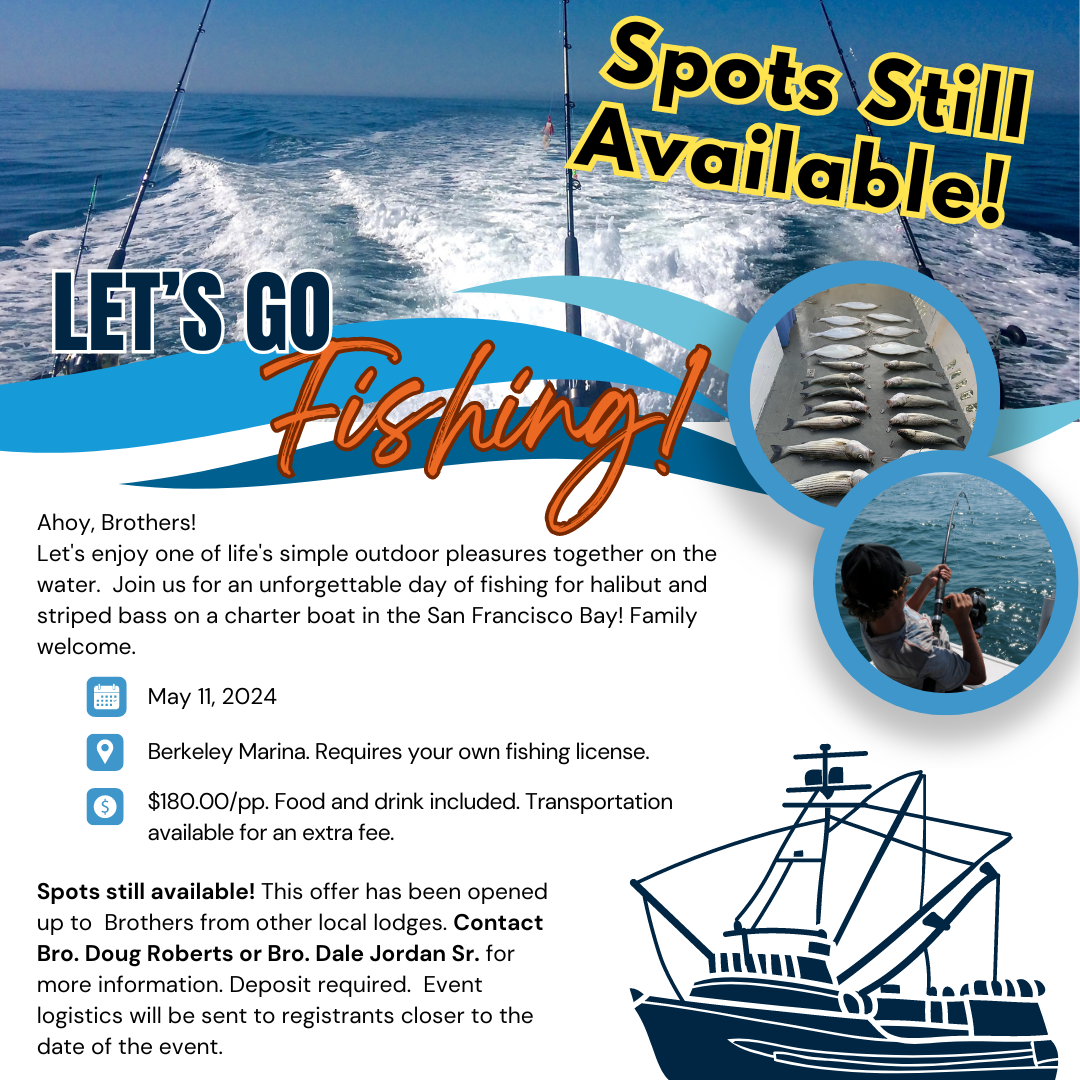 Ahoy, Brother fishermen and wanna-be fishermen, REGISTER to attend the San Francisco Bay fishing trip on Saturday, May 11. We must fill all the seats on this chartered excursion.