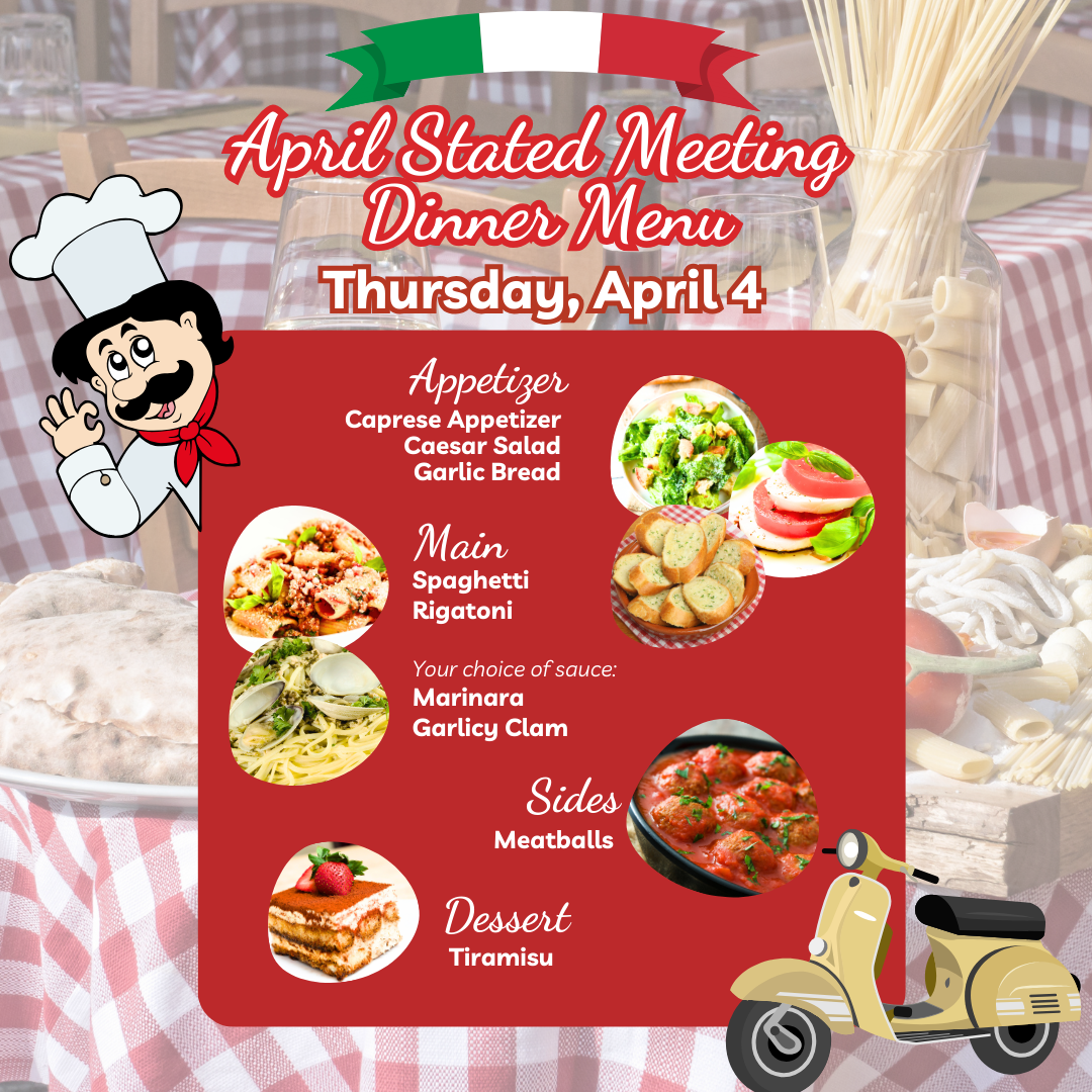 You do not want to miss our April Stated Meeting Dinner on Thursday, April 4, where we will be featuring an Italian feast - Buca di Natoma! Bring your family and friends to join us and RSVP to the Stated Meeting Dinner and Pre-pay for yourselves and guests.