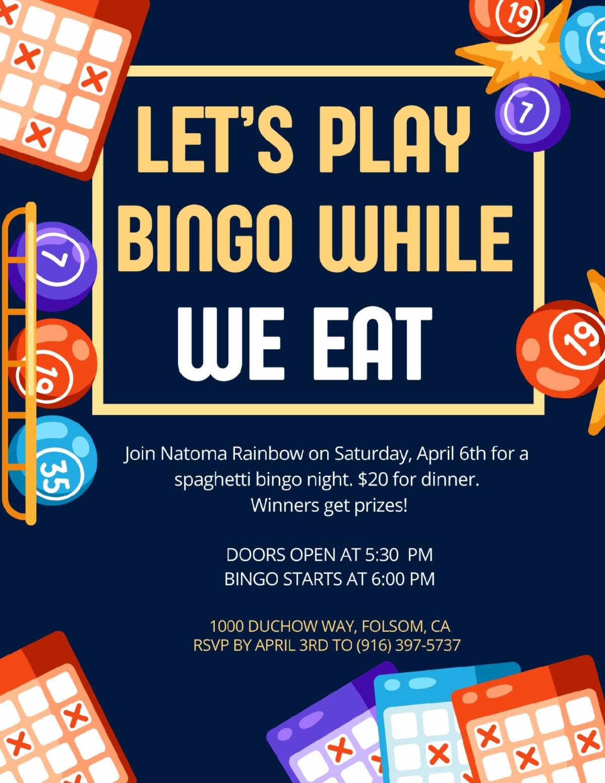 You all are invited to join us for a night of fun and YUM! We are having a fundraising event coming up that we would love to have you attend on Saturday April 6 starting at 5:30 p.m. RSVP by April 3 to (916) 397-5737. We'll be having another bingo night on May 18, so please mark your calendars to attend.
