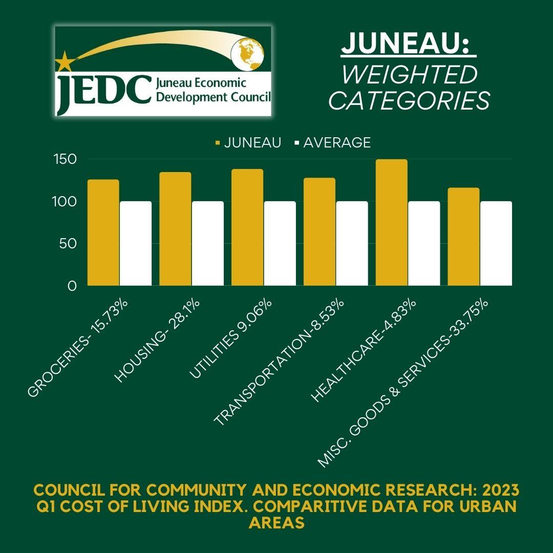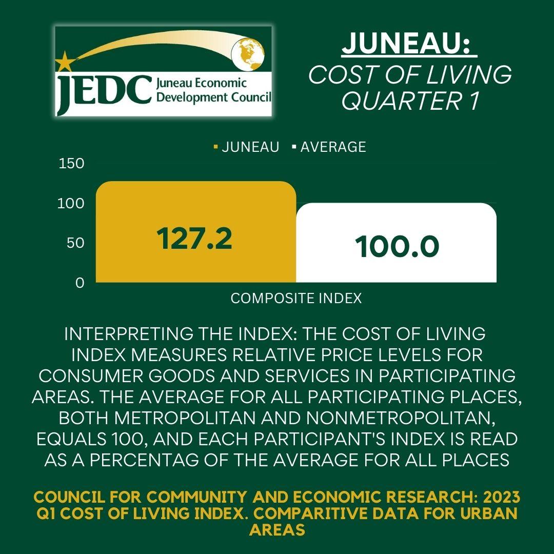 The Cost of Living Index measures relative price levels for consumer goods and services in participating areas. The average for all participating places, both metropolitan and nonmetropolitan, equals 100, and each participant’s index is compared to that average. JEDC staff collect data from numerous locations around Juneau regularly. We appreciate the cooperation we receive from businesses which makes Juneau participation in this quarterly indicator possible.