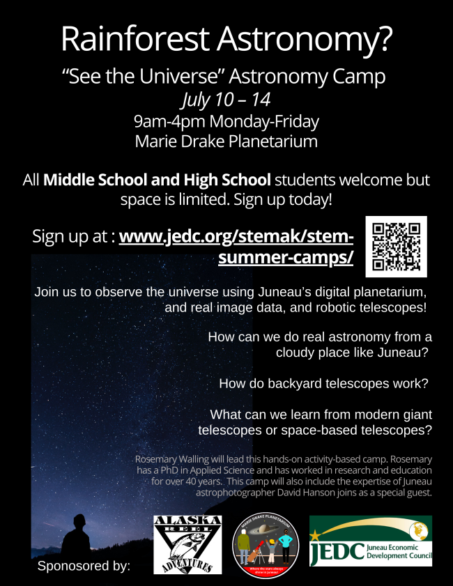 Learn astronomy basics while exploring the universe using real image data and robotic telescopes. How can we do real astronomy from a cloudy place like Juneau? How do backyard telescopes work? What can we learn from modern giant telescopes or space-based telescopes?