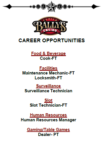 Food & Beverage Supervisor, Manager-Food & Beverage IV, Cook I, Cook II, Cook III (Lead), Server-Buffet, QE Cook II, QE Cook III, Concessions, Dishwasher (Steward), Sammy's Rockstar Host/Hostess, Sammy's Rockstar Server, Sammy's Rockstar Food Runner, Host/Cashiers (Buffet), Bus Person (Buffet), Porter, Bartender-Public, Cocktail Server, Bar Back
