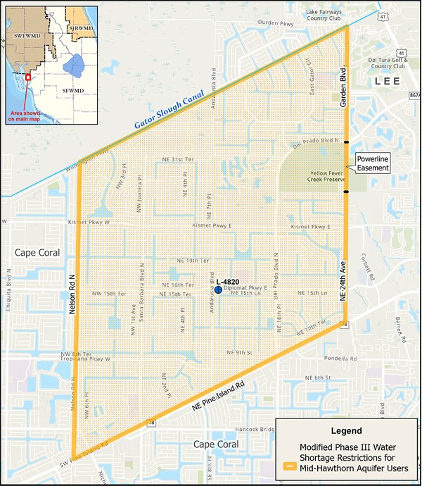 The South Florida Water Management District declared a water shortage and a temporary, mandatory irrigation schedule is in effect for a portion of Northeast Cape Coral and unincorporated Lee County. Please see the map for the affected area.