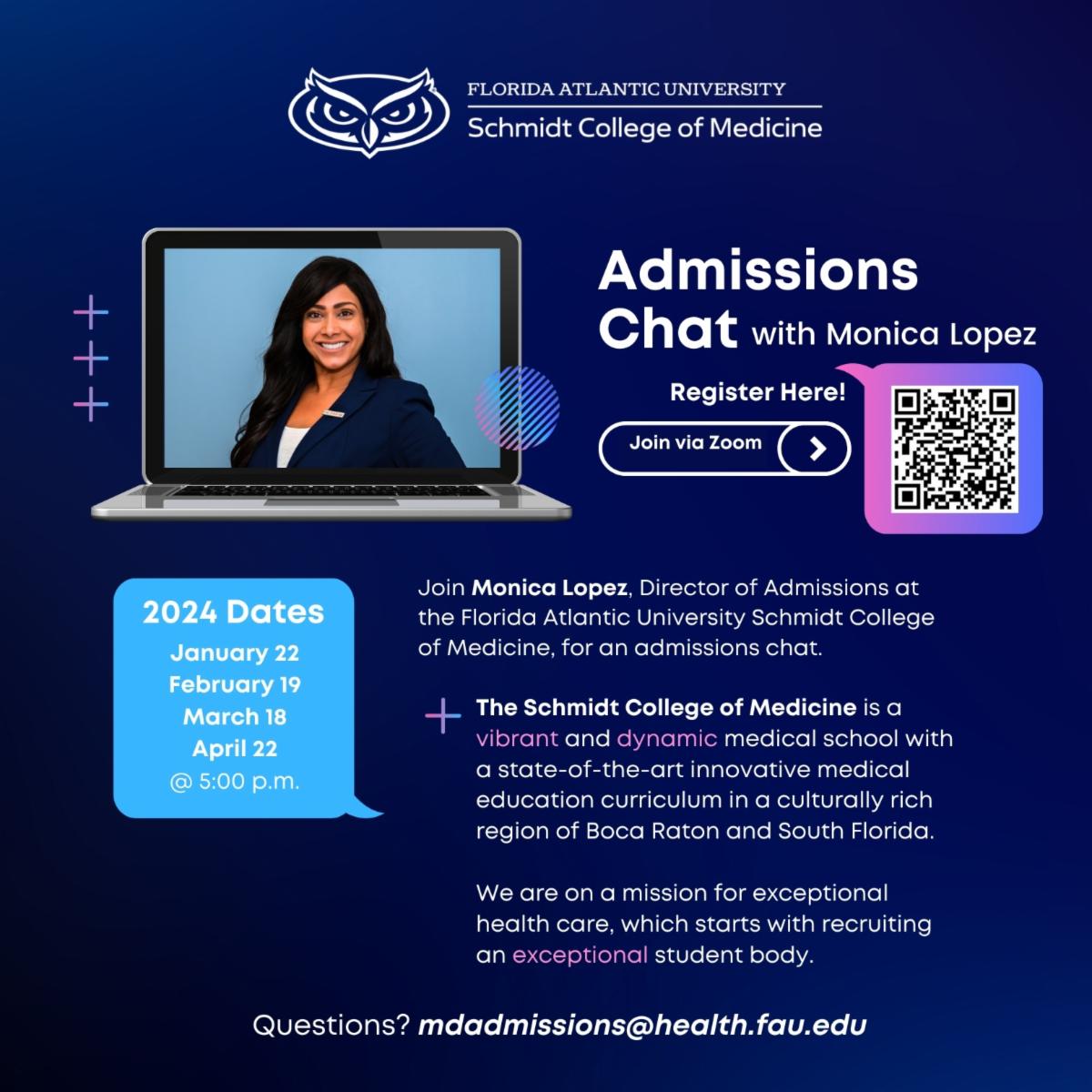 Join the Director of Admissions at Florida Atlantic University’s Schmidt College of Medicine for a virtual chat on all things admissions. This is a laid-back session—no MCAT scores, transcripts, or resumes required. Everyone's invited, whether you're a prospective applicant, parent, or academic advisor. Topics include overall admissions requirements, an application process overview, and a Q&A session.