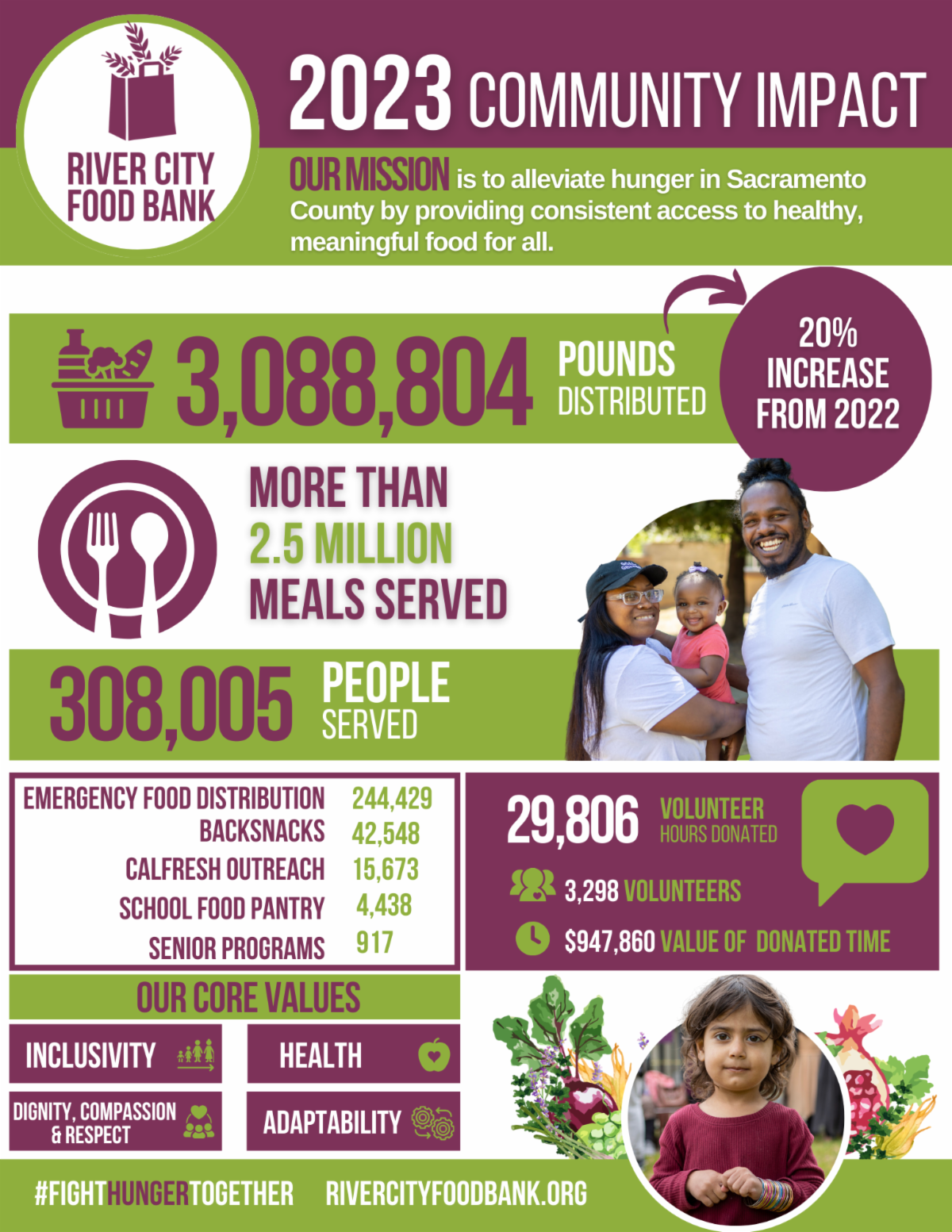 River City Food Bank is thrilled to share our 2023 Community Impact Report, a testament to the exceptional support of our community. This year, we witnessed an extraordinary display of dedication from our team, overwhelming generosity from donors, and invaluable contributions from volunteers.