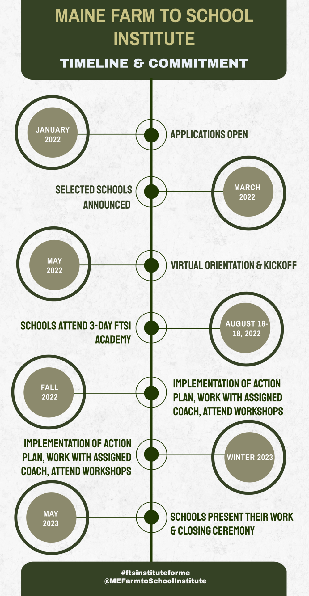 The Maine Farm to School Institute is a unique opportunity to impact your entire community! It is a year-long professional opportunity for Maine schools/districts to develop a Farm to School (FTS) program. The Institute begins with a team self assessment, followed by the Academy Program where teams learn about the 3 Cs of a FTS program (cafeteria, classroom, community), discover the opportunities and resources in Maine, develop a vision for their FTS program, develop an action plan to implement that vision, network with other FTS champions, and receive guidance from an assigned Coach!