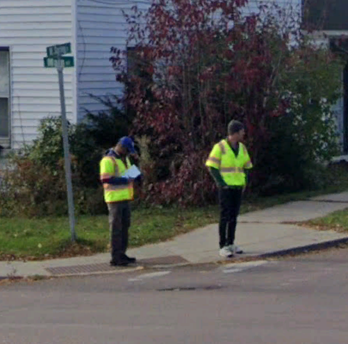 CCRPC's Chris Dubin and Sai Sarepalli are preserved in Google Street View history at the corner of Main St. and Spring St. in Winooski while gathering data for the ADA Transition Plan. This work included investigating curb ramp dimensions, slope, and pedestrian push buttons to determine ADA compliance and deficiencies.
