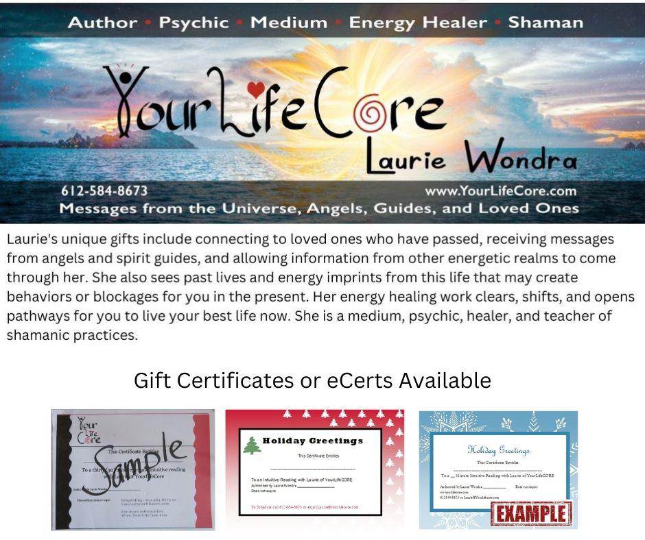 YourLifecore.com, or for private readings email Laurie@yourlifecore.com or 612.584.8673
