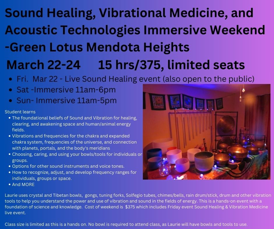 **Scheduled March 22-24, 2024 - Intensive Weekend of Learning Sound Healing and Vibrational Medicine - Join me at Green Lotus Studios for hands on learning - watch for more information soon or email Laurie for details.
