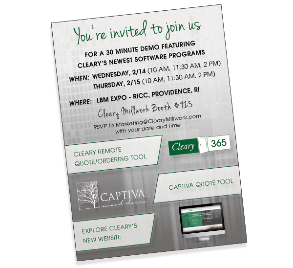We are excited to introduce Cleary 365, our remote quote & ordering tool, Captiva quote tool and the new Cleary Millwork website. We invite you to sit down and join us for a 30 minute demo featuring these new software programs.