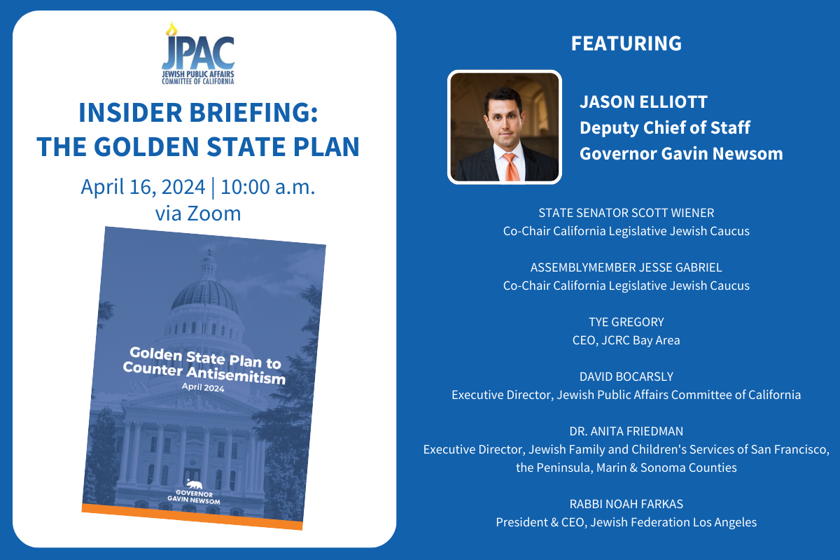 Join us on Tuesday for an Insider Briefing about Governor Newsom's newly released Golden State Plan to Counter Antisemitism. The one-hour briefing is this coming Tuesday, April 16th, at 10:00 AM via Zoom.