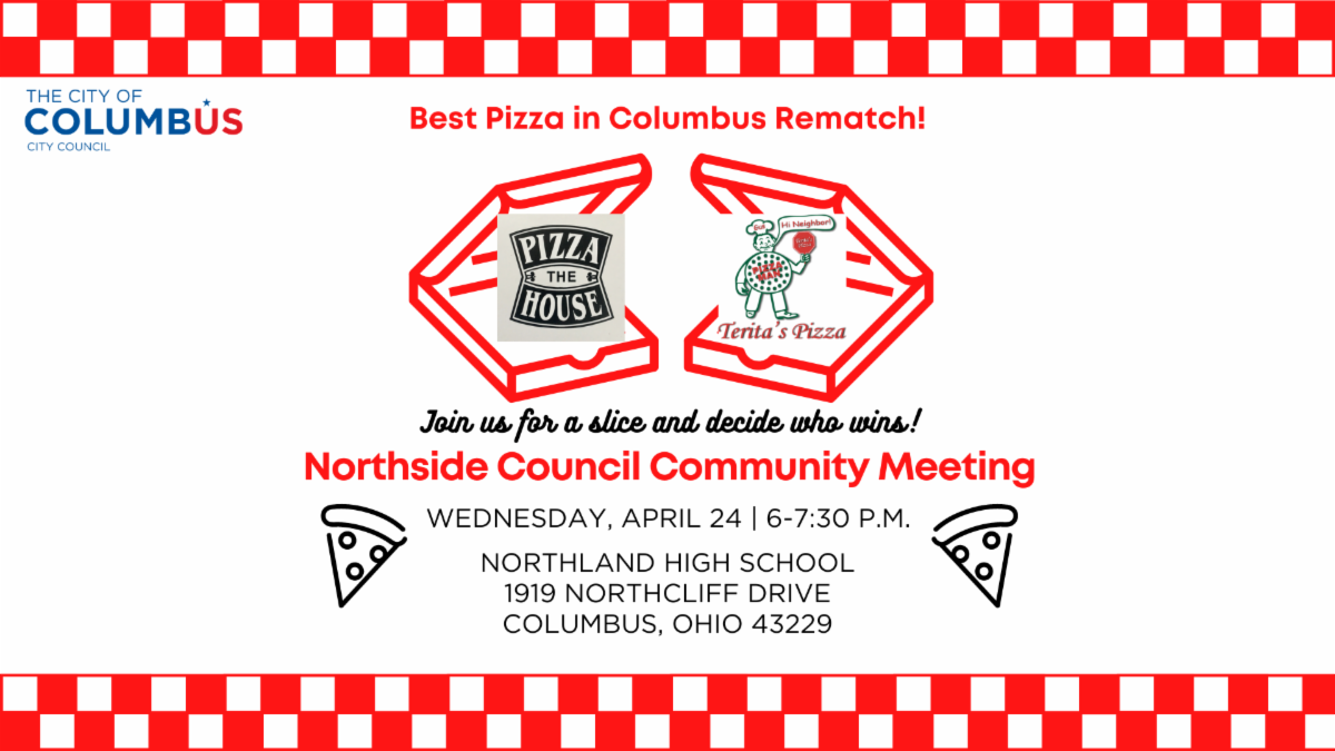 Join Columbus City Council to discuss opportunities for building strong neighborhoods in the Northside community. We're also having Terita's Pizza and The Pizza House go head-to-head to decide who has the best pizza in Columbus! Come grab a slice and get to know your council members.