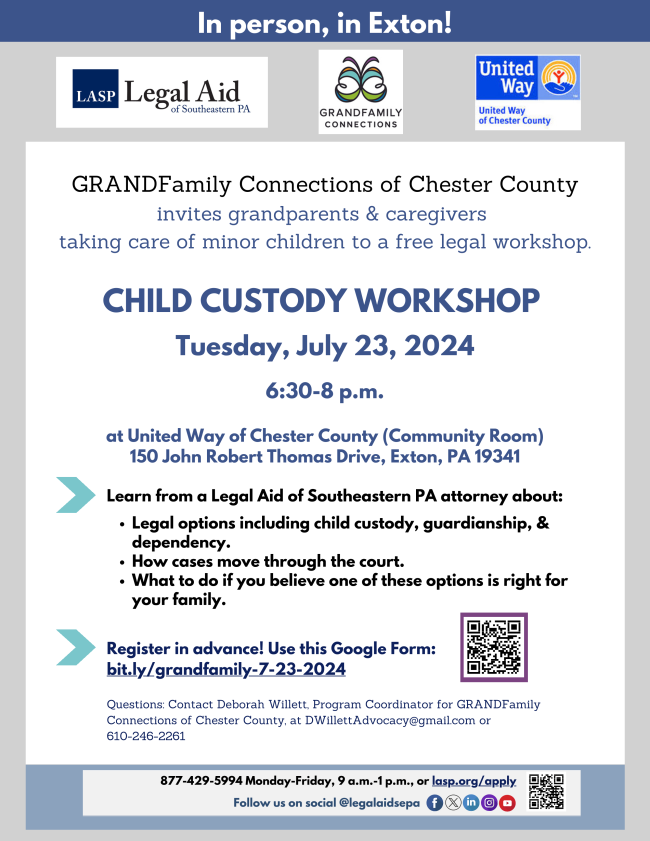 EXTON - Join GRANDFamily Connections of Chester County and LASP for a free Child Custody Workshop.