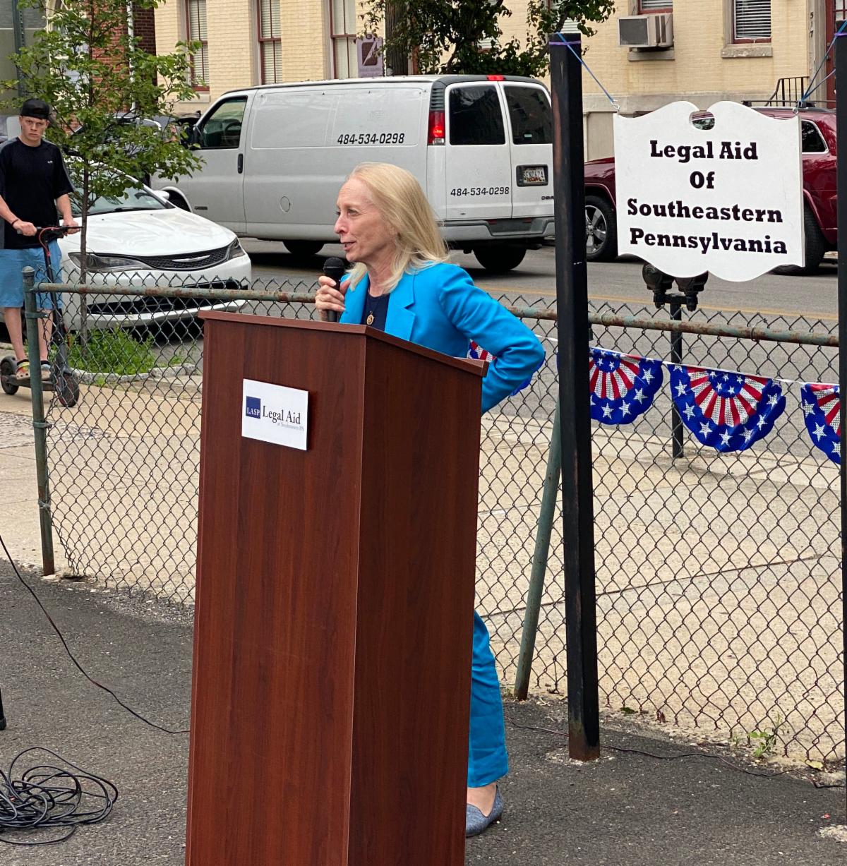 NORRISTOWN - Celebrating local legal aid with the community, LASP held an Open House along Swede Street in Norristown on May 29. Congresswoman Mary Gay Scanlon, Co-Chair of the Congressional Access to Legal Aid Caucus; Hon. Carolyn T. Carluccio, President Judge, Montgomery County, PA Court of Common Pleas; and Lisa A. Shearman, 2024 President, Montgomery Bar Association, joined LASP Executive Director Shawn Boehringer to share remarks on the impact and importance of legal aid.