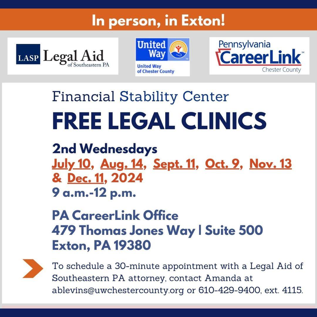 EXTON - A free monthly legal clinic will be at PA CareerLink of Chester County on the second Wednesday of the month through December 2024.