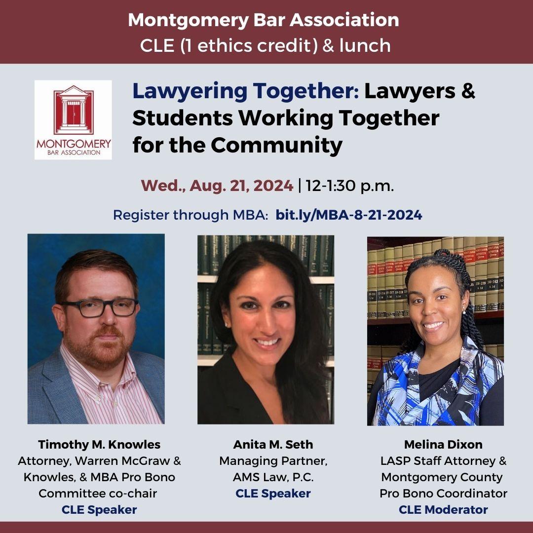 Melina Dixon, LASP Staff Attorney & Montgomery County Pro Bono Coordinator, will moderate the discussion and review the ethics involved when working with students to complete legal work. Lawyering Together is a great opportunity for attorneys to help students develop their skills while also giving back to the local community.