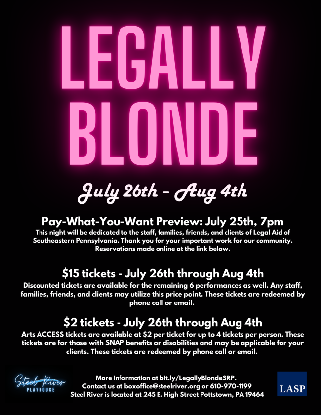 POTTSTOWN - On Thursday, July 25, Steel River Playhouse will host its first ever Pay-What-You-Want Preview of "Legally Blonde: A Musical!"