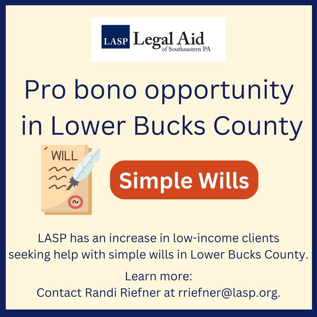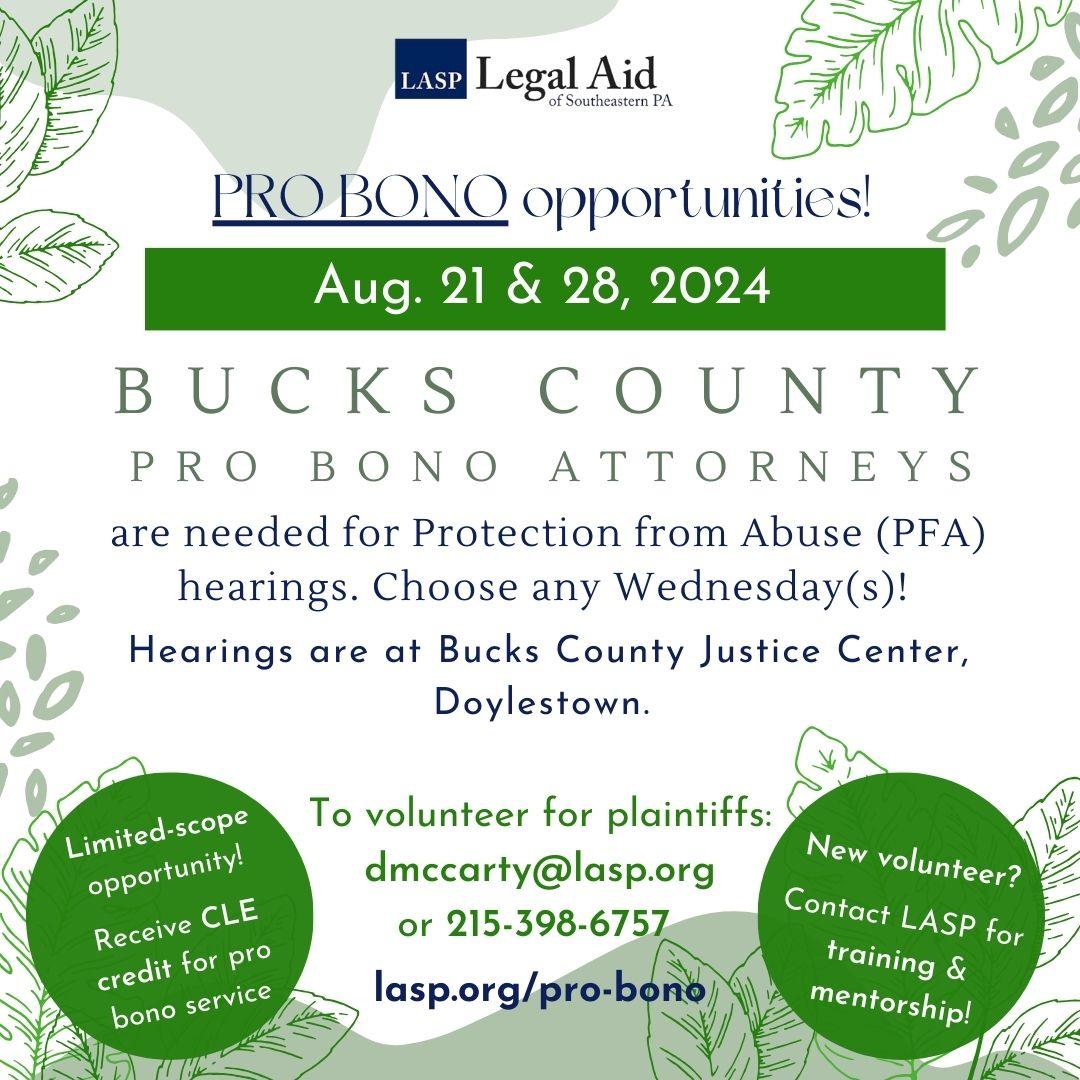 Court Mediation with the Bucks County Opportunity Council, LASP & the Bucks County Bar Association. LASP urgently needs pro bono attorneys to help with this program in Morrisville most Thursdays at 1 p.m.! To learn more, scroll up, visit lasp.org/pro-bono, or sign up directly for a specific date at lasp.org/pro-bono-opportunities.