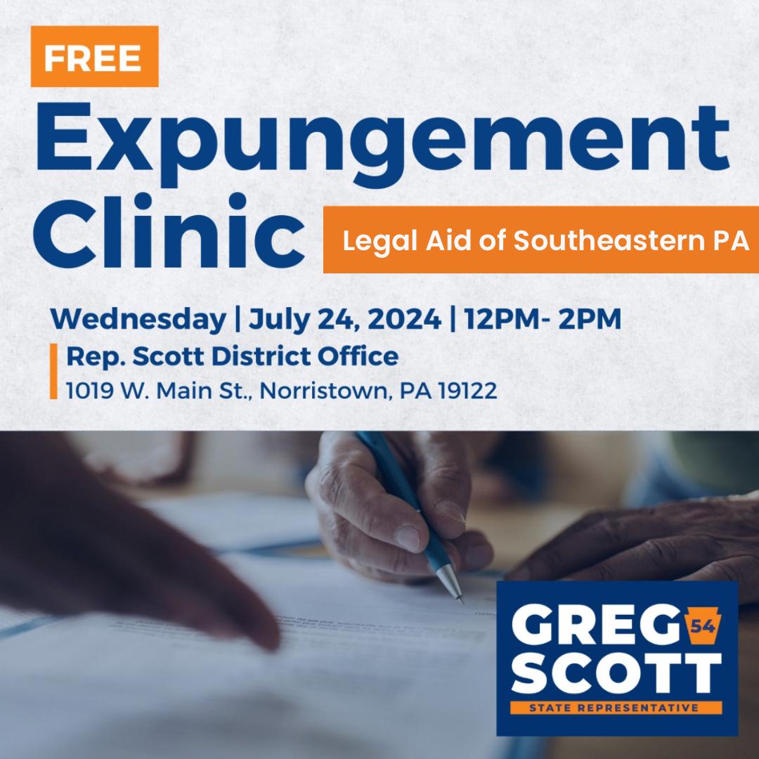 NORRISTOWN - Join Rep. Greg Scott and Legal Aid of Southeastern PA for a free Expungement Clinic.