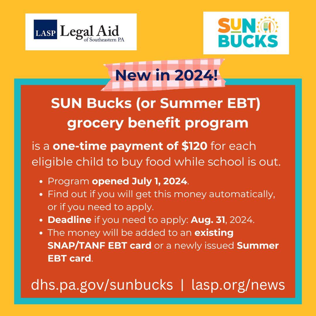 SUN Bucks (or Summer EBT) is a new federal grocery benefit program which opened on July 1. The PA Dept. of Human Sservices is administering Pennylvania's program.