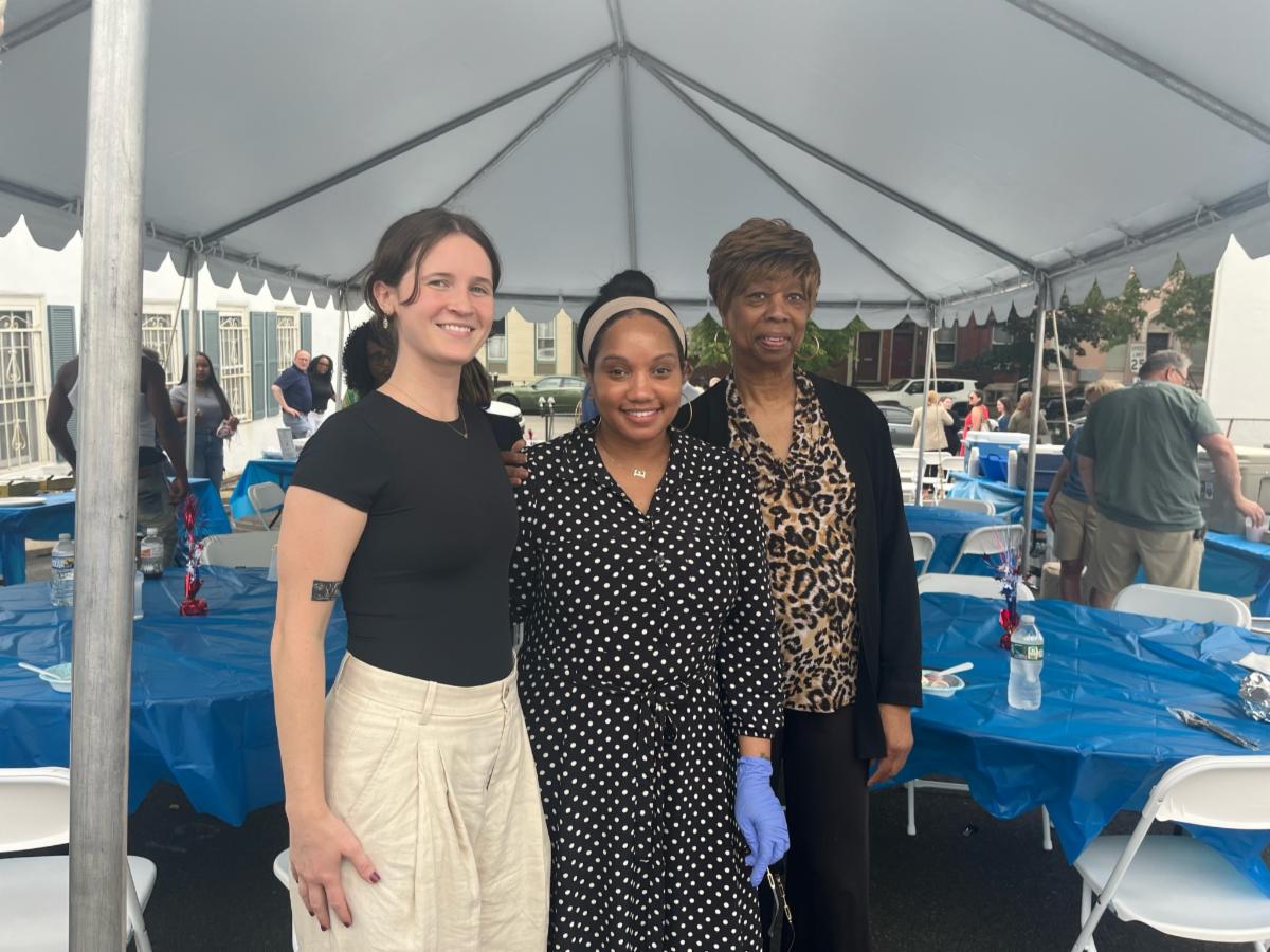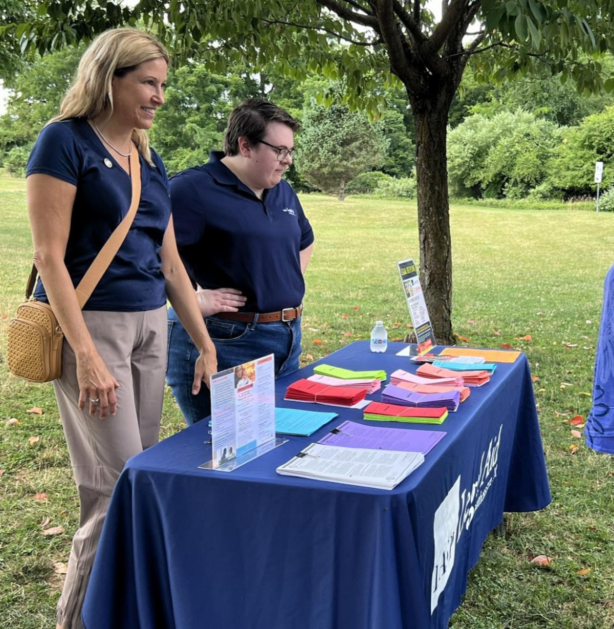 WAYNE - At State Rep. Melissa Shusterma's Veterans BBQ, Justice Simanek (at right), LASP Veterans Advocacy Project Staff Attorney, and Rep. Shusterman discuss LASP services with an attendee. The annual event was July 13 at Wilson Farm Park in Wayne / Chesterbrook.