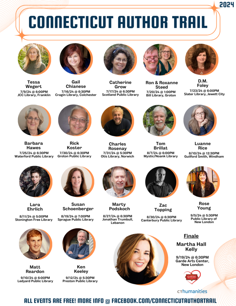 Join us and meet authors at these free library events all summer long. The CT Author Trail runs from July 9th - September 19th with area libraries featuring local authors. The program kicks off at the Janet Carlson Calvert Library in Franklin on July 9th with guest author Tessa Wegert. We will host Scotland author, Catherine Grow, on July 17th at 6:30 p.m. The Finale is September 19th at the Garde Arts Center in New London and features best selling author Martha Hall Kelly.
