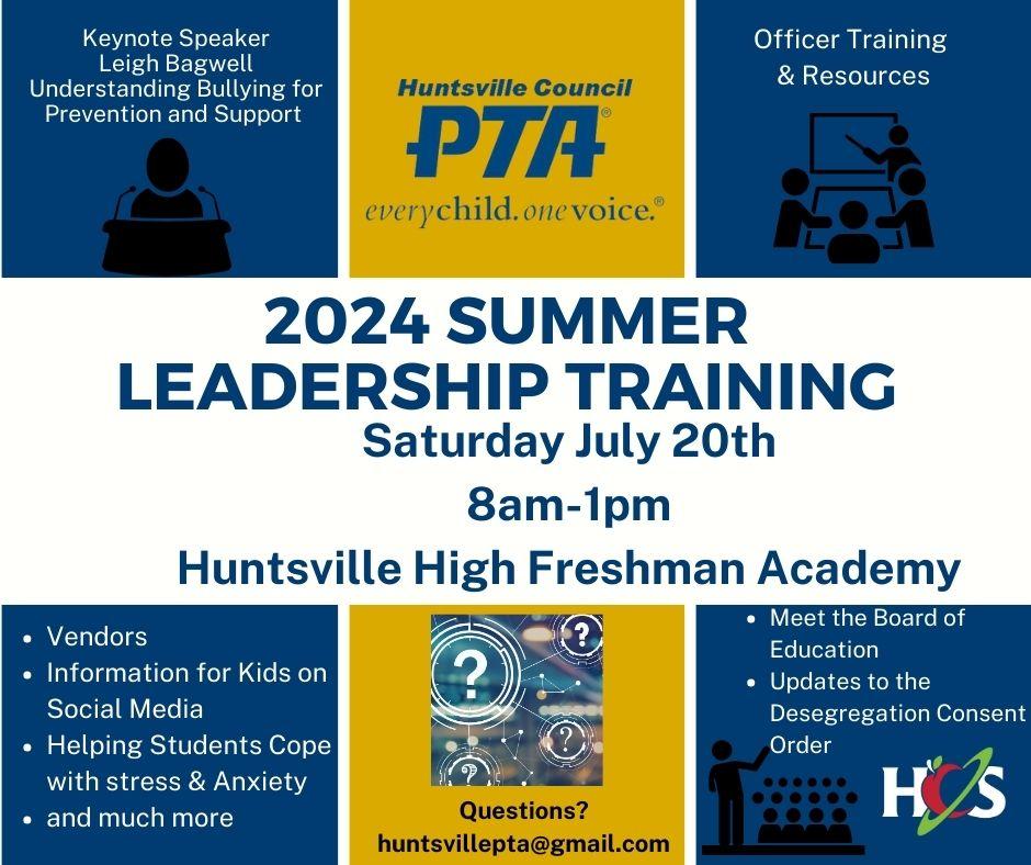 July 20 HCPTA will hold the Annual Leadership Training at HHS Freshman Academy. This event is not just for PTA leaders. There will be something for everyone!