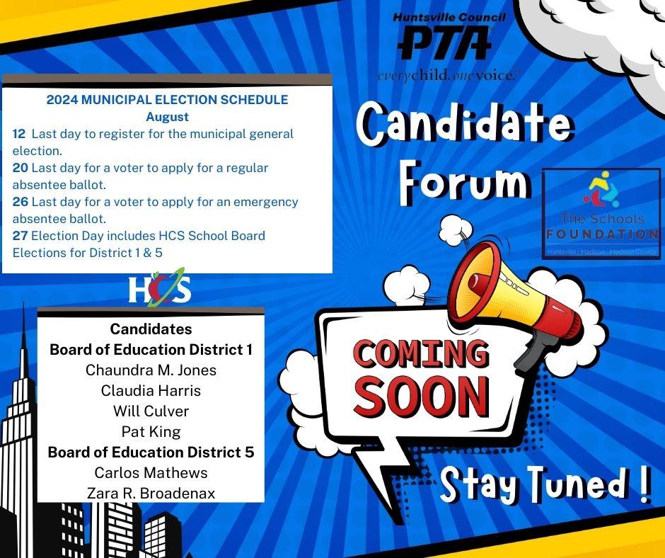 In partnership with The Schools Foundation, we will host a candidate forum in August, TBD. You can find more information about Huntsville City Municipal Elections here. 2024 Municipal Candidates here.