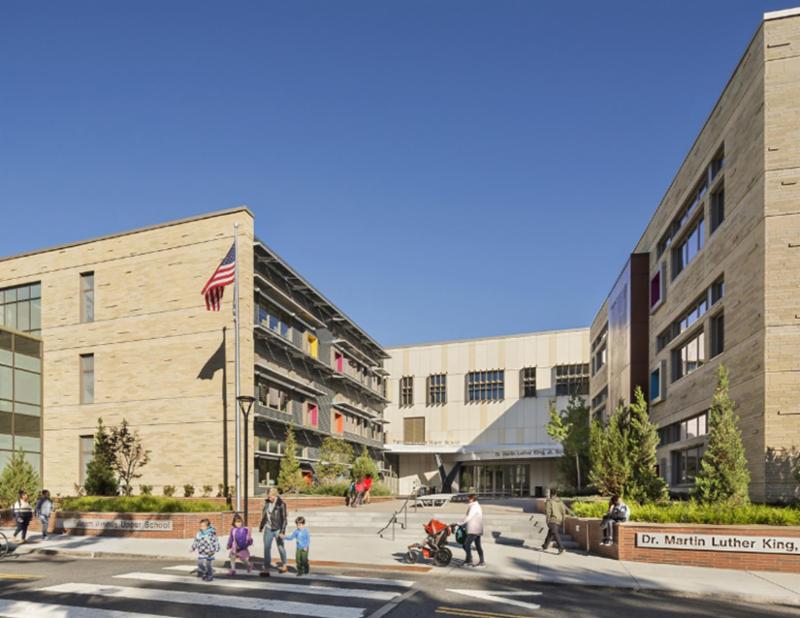 The design team, led by Perkins Eastman, was tasked to create a high-performing building and a community school that responded to the needs of its neighbors. The project was complicated by the school's small and irregular site; the large and complex program accommodating 740 children from preschool to 8th grade; a robust after-school program; and an array of engaged stakeholders.