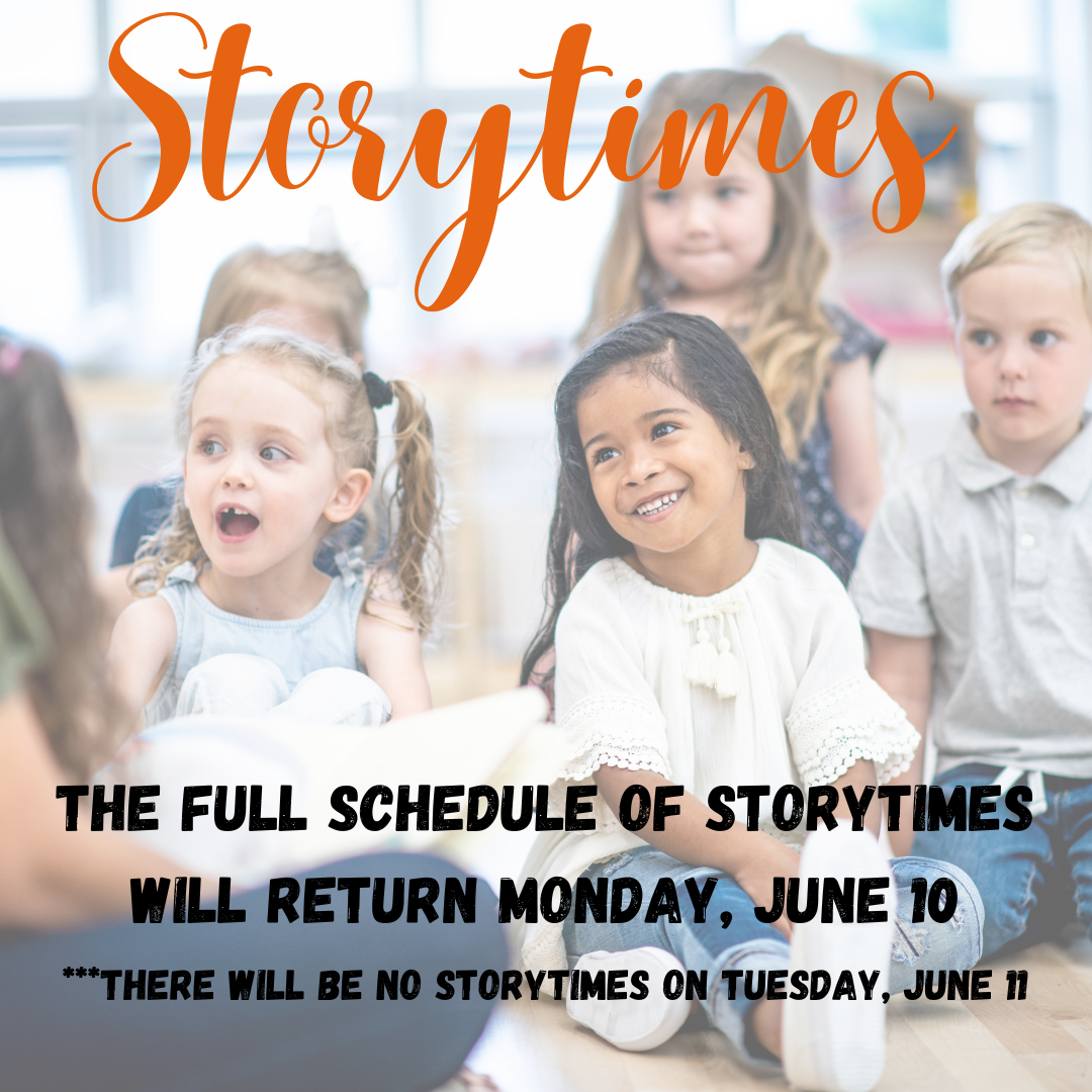 Summer Storytimes will start on Monday, June 10th. There will be no Storytimes on Tuesday, June 11th. | |