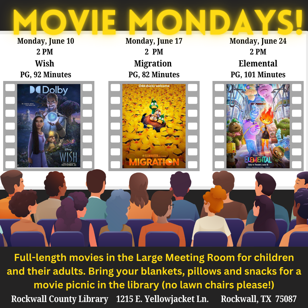 Starting June 10th, join us every Monday at 2 PM in the Large Meeting Room for full-length movies for children and their adults. Bring your blankets, pillows and snacks for a movie picnic in the library (no lawn chairs please!) | |