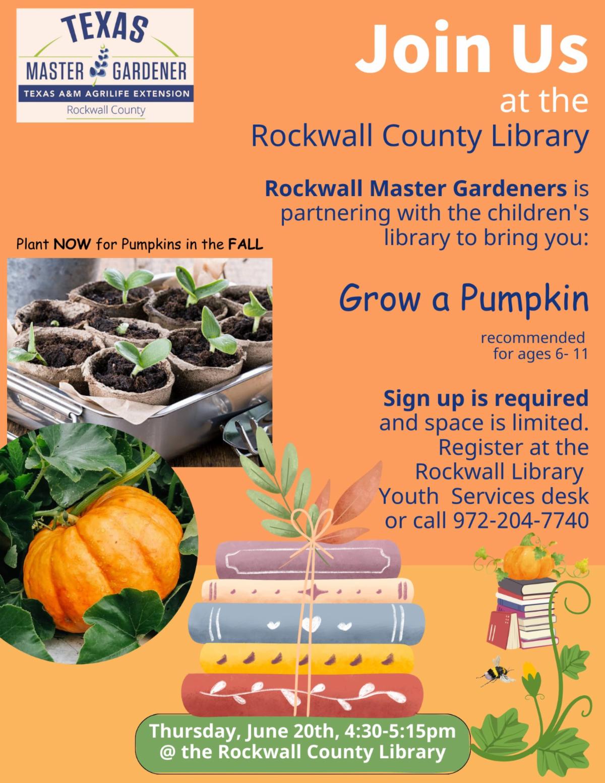 Summer is just now kicking off, but did you know that NOW is the time to plant your pumpkins, so they'll be ready for fall? Join us on Thursday, June 20th for our Grow a Pumpkin program, where we'll be working with the Rockwall Master Gardeners to plant pumpkins! Space is limited so registration is required. Sign up at the Youth Services Desk or by calling 972-204-7740. Recommended for ages 6-11. | |