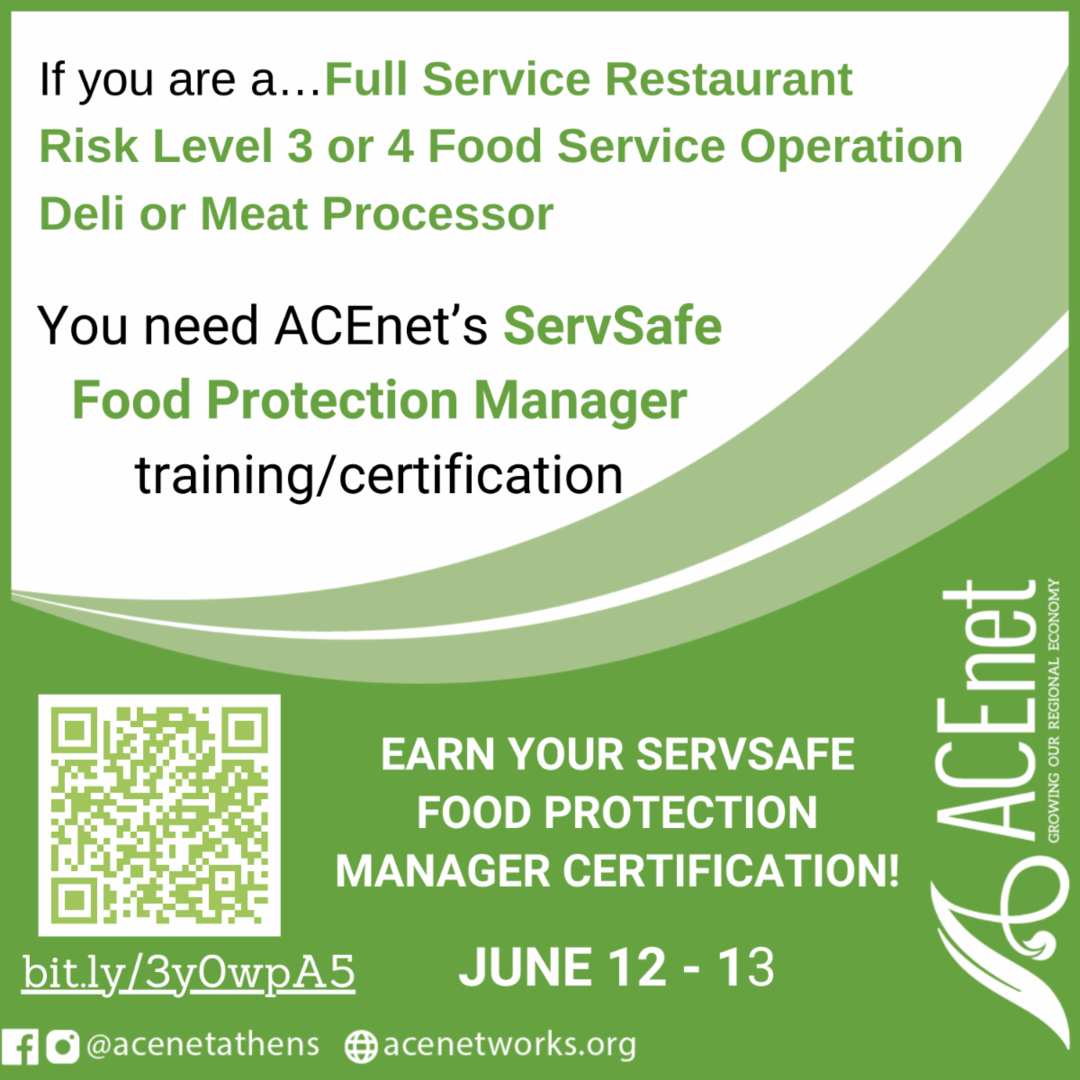 Only one spot left in this training! ACEnet's next 2-day ServSafe Food Protection Manager Training/Certification is going to be on June 12th-13th beginning at 9am!