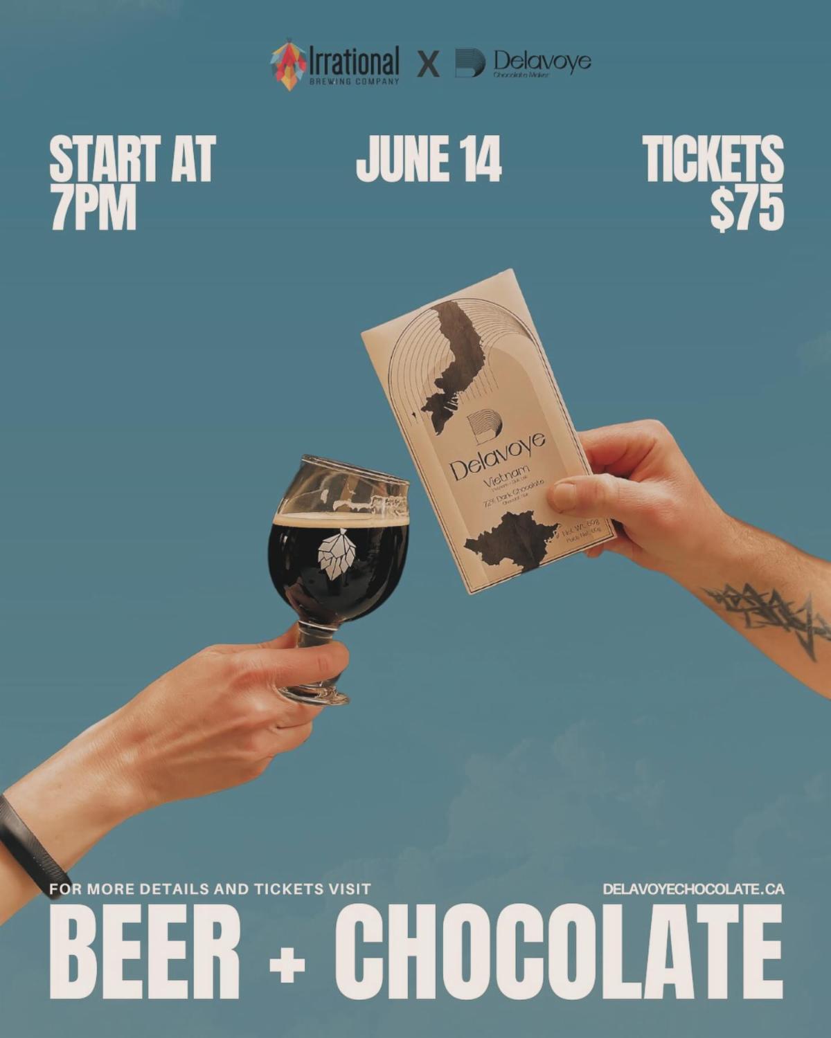 Irrational Brewing X Delavoye Chocolate - Amazing neighbours coming together to present a fun and unique collaborative experience. During this 90-minute event, explore chocolate and beer, and ways to best enjoy them together. Concludes with a tour of Irrational Brewing.